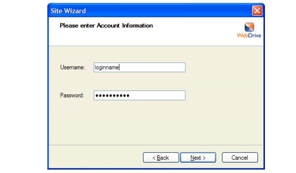 A WebDrive dialog box appears, asking you to “Enter Username/password”.