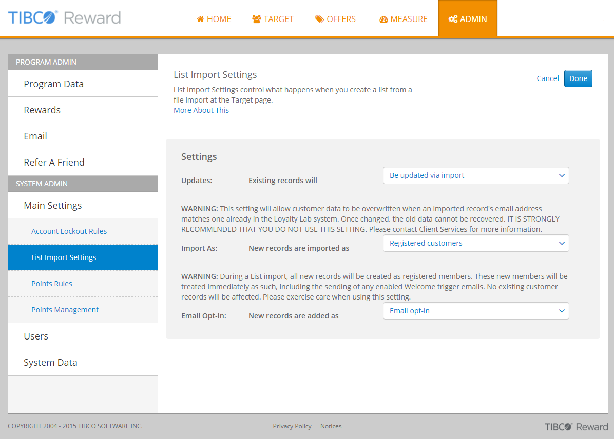 List import settings control what happens when you create a list from a file import at the Target page.