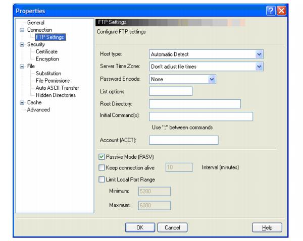13. In the directory tree structure, click Connection > FTP Settings. Then select the Passive Mode (PASV) check box.