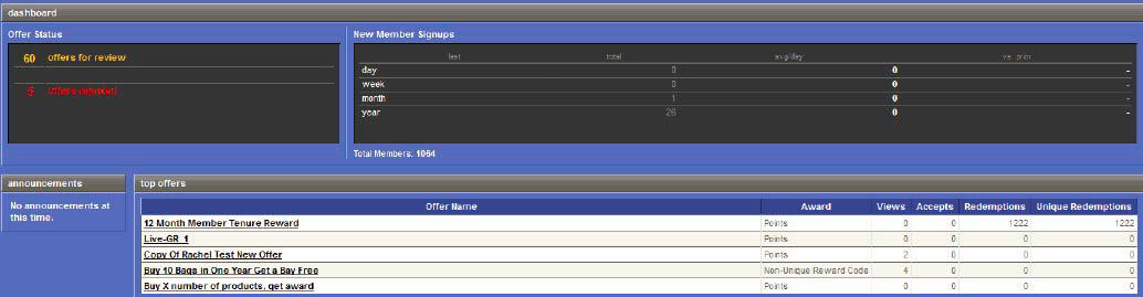 The dashboard section provides tables and graphs indicating the level of customer response to the loyalty program. It includes information on the status of offers generated by CRMS. You can view different periods to see the performance over the past year, quarter, month, or week.