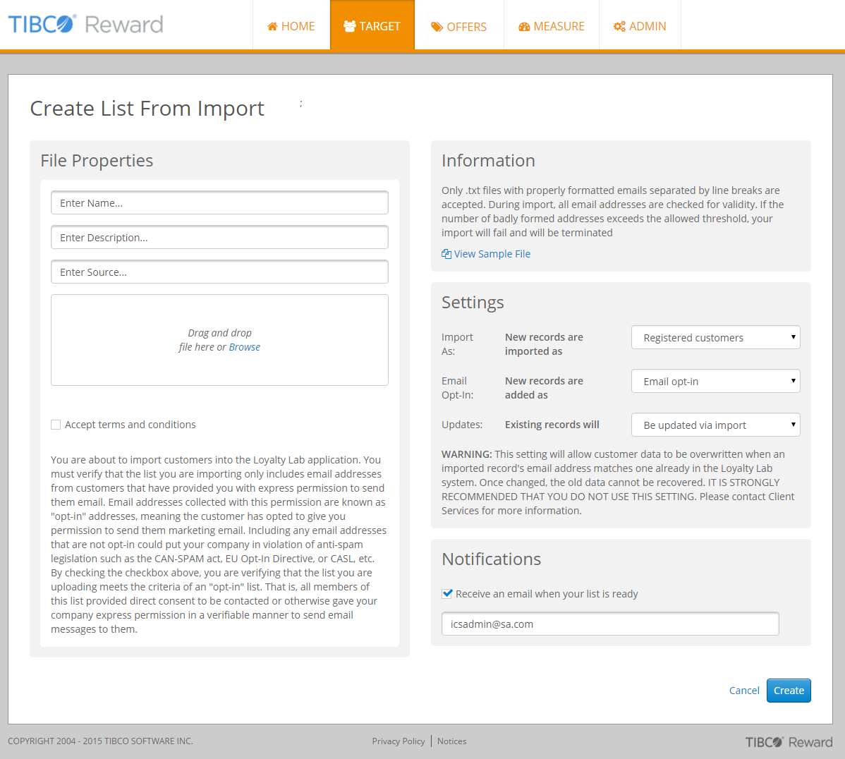 - From the Target > Customer Lists page, select Create New > List From File Import.