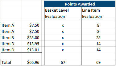 When you evaluate at the Basket level, that rounding happens once, on the basket total. When you evaluate at the Line Item level, the rounding happens on every item. While two points is not a big difference, it is still a difference of about 3% -- extend that to a million transactions, and it is a 2,000,000 point difference.