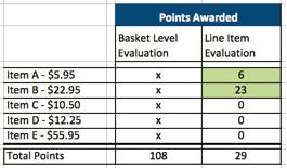 When the system evaluates all basket contents, it still looks at each item in the basket, but points are calculated on the total of the qualifying items in the transaction.