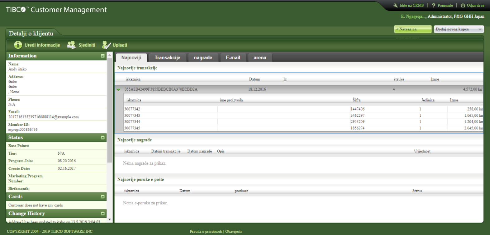 The Customer Details page also provides tabs on the right panel to get details about Transactions, Rewards, Emails and so on. If CSR is configured for additional tabs to provide more information, those tabs are also displayed.