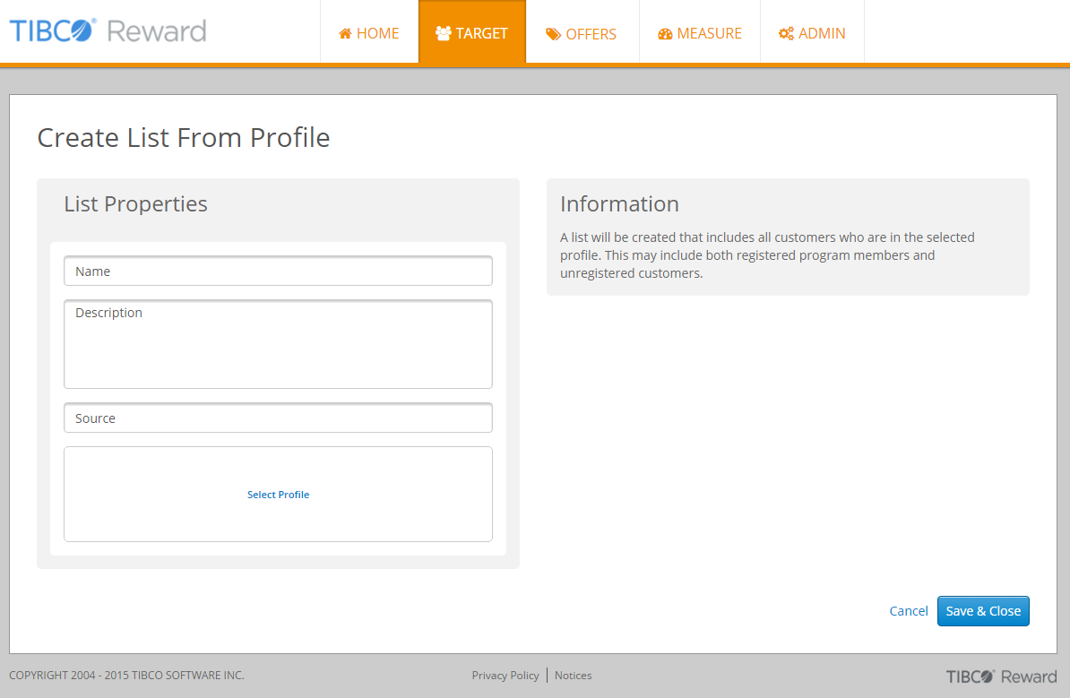 - From the Target > Customer Lists page, select Create New > List From Profile.