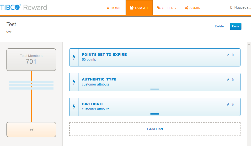 - Customer profile name once entered is displayed in another section at the bottom of the panel. And, eventually the filtered profile count is displayed there.
