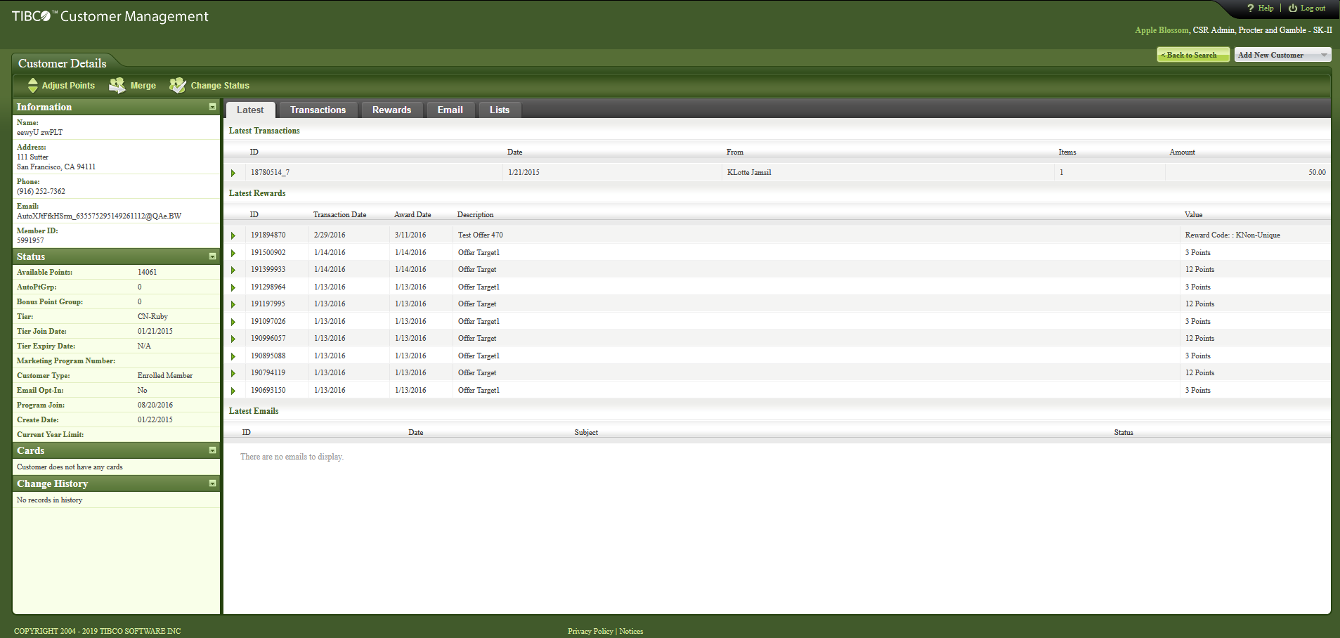 The Customer Details page also provides tabs on the right panel to get details about Transactions, Rewards, Emails and so on. If CSR is configured for additional tabs to provide more information, those tabs are also displayed.