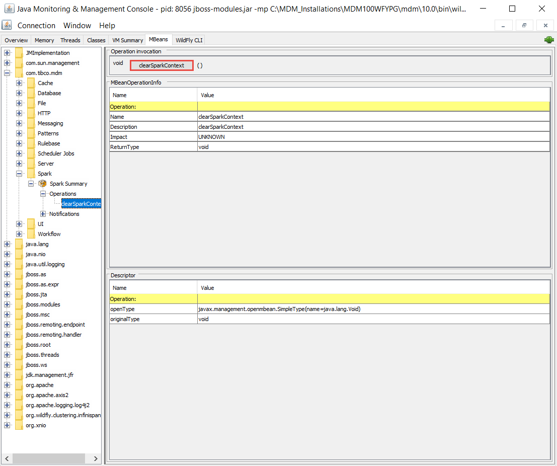 You can perform the clearSparkContext operation by using the Spark MBean.