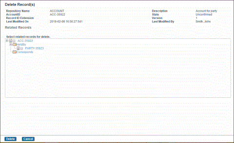 - Check the check box next to recordID-recordIDExtension for the related record that you want to delete. When you select a related record, all its associated related records also get automatically selected. If the selected related records has an associated relationship, it will not be deleted. For example, assume that Customer is related to Address and Address to Status repository. If you mark Address for deletion, Status will automatically be marked for deletion. Similarly, if you uncheck Address from being deleted, its child relationship will also be retained.