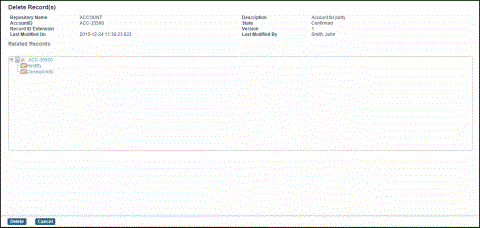 The Delete Record(s) page is displayed.If the record consists of relationships, select the relationships that you want to delete in the Related Records section. For more information about deleting related records across repositories, see Deleting Records in Cross-Repository Relationship.