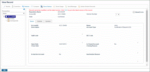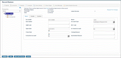 - Click the earlier version of a record that you want to restore. The View Record page is displayed with a warning message.