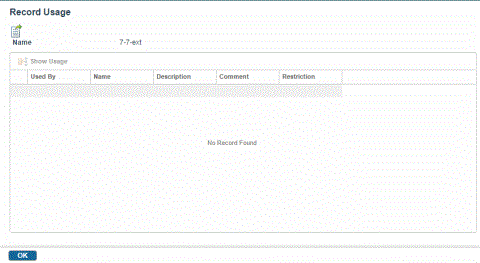 . The Record Usage page is displayed. The page displays the following record information: used by, name, description, and restriction.