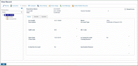 Repository information: This section of the View Record page displays the name of the repository in which the record exists. It also displays the Show Errors check box. If any errors exist, they are displayed in red.Attribute Group Information: This section lists all the attribute groups and the attributes contained by each group in separate tabs on the page. The attribute group display is subject to security access controls. If you have categorized attributes in a group, they are displayed in a separate tab. All attributes that do not fall under any group are displayed under the UNASSIGNED tab. To know more details about an attribute, point on the attribute name to see Attribute help.Other than the