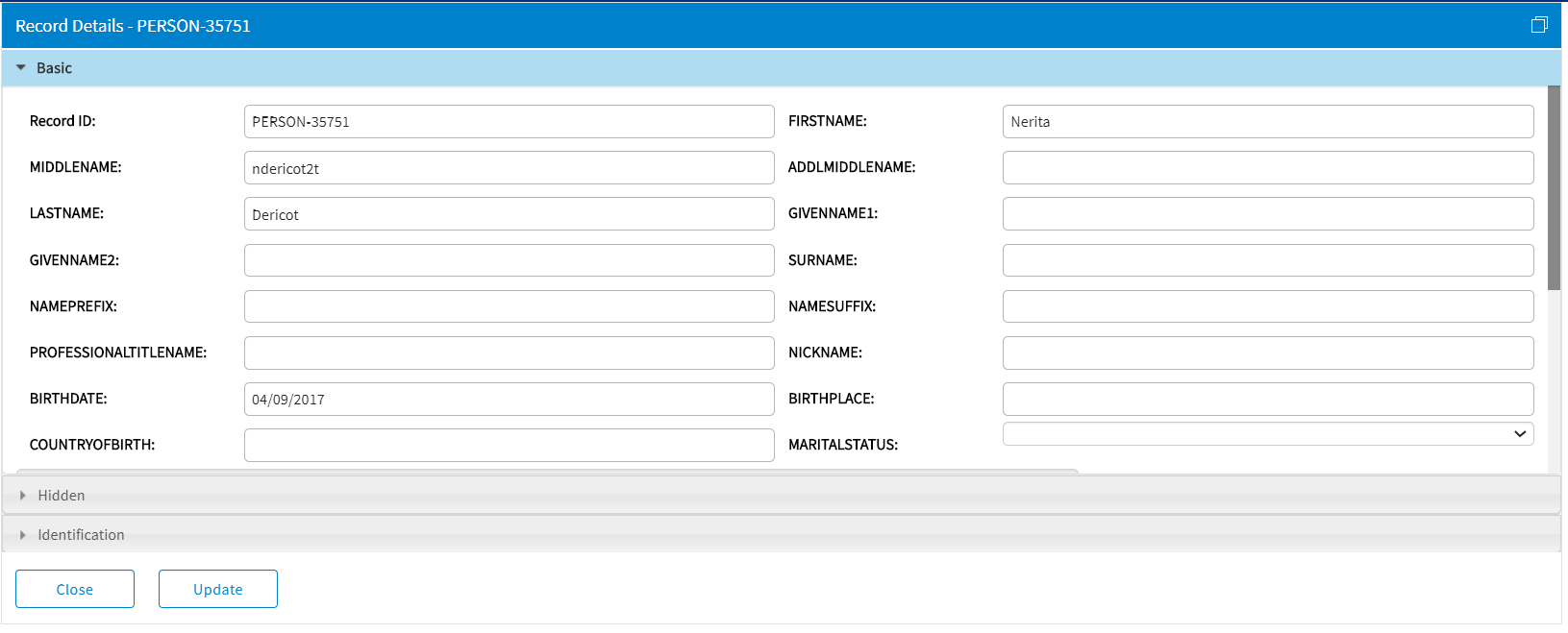 The Record Details window is displayed. You can maximize the window to view details of each attribute group.