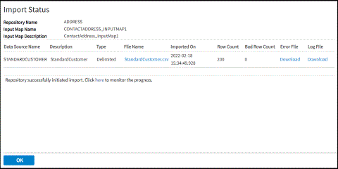 Download link in the Log File column. This file includes an import summary for each repository, which provides count for rejected, duplicate, added, and modified records.