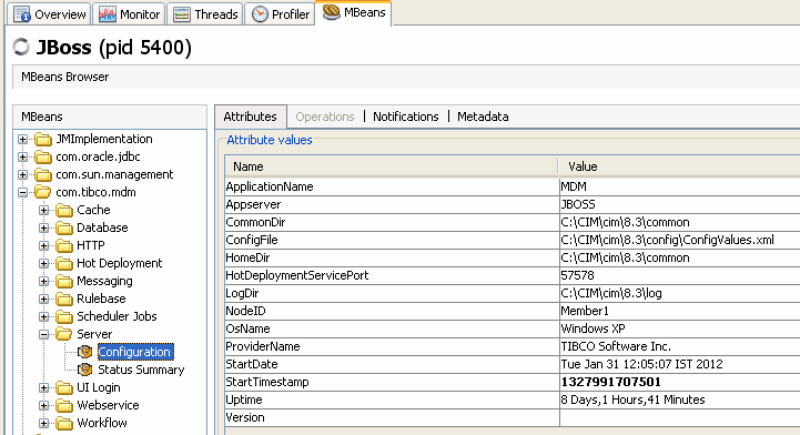 Configuration displays the configuration of TIBCO MDM server and values of the important environment variables.