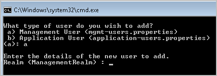 - Navigate to$JBOSS_HOME/bin directory and run add-user.bat or add-user.sh file. The following two options are displayed in the command prompt.