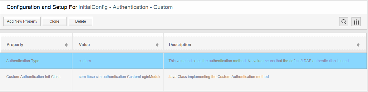 The properties are similar to LDAP except the authentication class. Specify the com.tibco.cim.authentication.CustomLoginModule class.