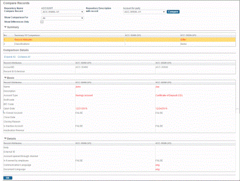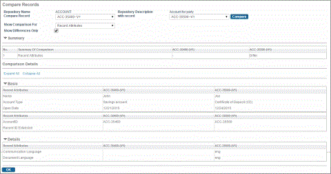 Note: If you want this check box to be cleared for the first time you login, change the value of the Show Differences only check box using the Configurator, and then log in to the application.A summary of comparisons is displayed in a tabular form in the Summary section of the page. Click the record attribute row or relationship attribute row in the table of the Summary section to view the details of the comparison in Comparison Details section of the page.