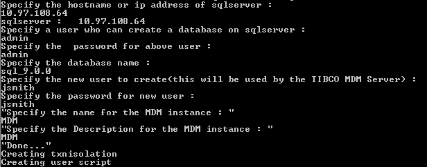 C:\tibco\mdm\version\db\sqlserver\configure>doall.batThe script prompts for the following information: