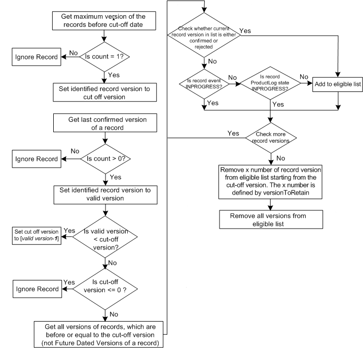 Purging history including any associated workflow processing data, removes data which is no longer important. Purging older record versions removes the versions which are superseded by other versions. It is recommended to run Purge periodically to purge history and older record versions.