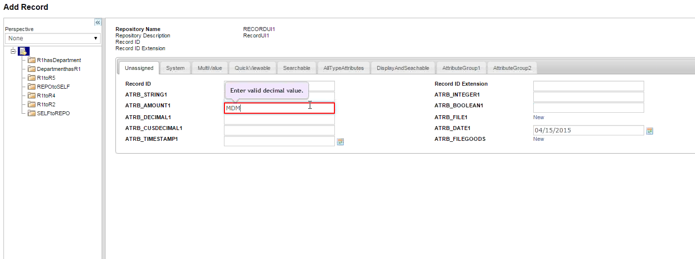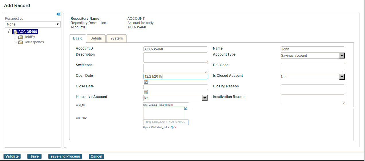 - Enter values in other fields. The field names are displayed based on the attributes created for each repository.