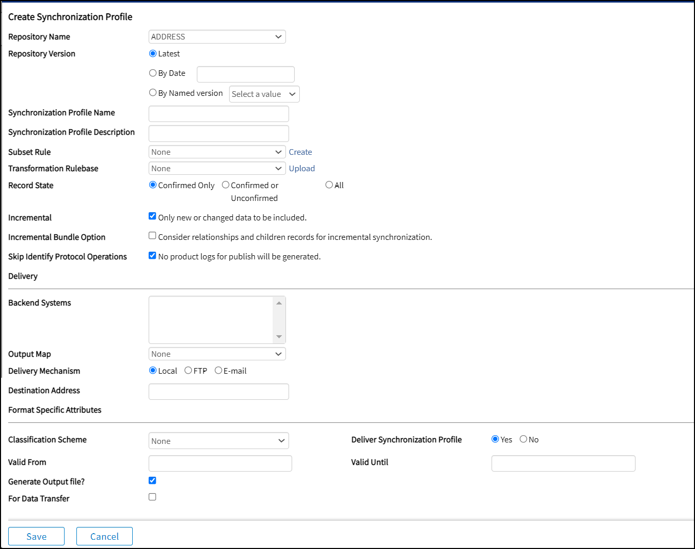 Synchronization Profile Name Specify the name of a synchronization profile. Synchronization Profile Description Specify the description for a synchronization profile. Subset Rule Select the subset rule from the drop-down list or click Create to create the subset rule. Subsets created from this page are private, meaning, such subsets are only visible to the user who created them unless visibility of this subset is changed and permissions are granted to other users using permissions. Refer to Resource Security for details on permissions. You can also browse the selected subset to verify the records that are included. Note that the record list shown here is indicative only as subset are re-evaluated on synchronization. If no subset is selected, all records in the repository are included. If you edit a synchronization profile which already has subset assigned and you do not have browse or edit permissions, you will not be able to edit or browse the subsets. Transformation Rulebase Select a Transformation Rulebase from the drop-down list or click Upload to upload one directly from here. Transformation Rulebase validates the records being exported. The changes to the data do not affect the repository. Note that the transformation rulebase uploaded from here cannot be removed. Record State Select the following record state options: - Confirmed Only: Confirmed means that the last confirmed versions of records, if not deleted are included. Note that only last qualifying version is included.