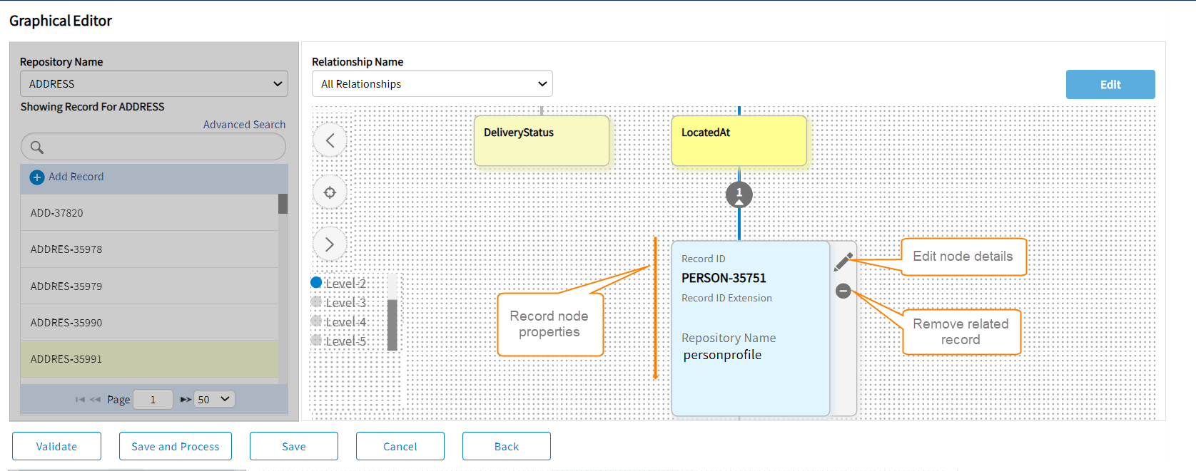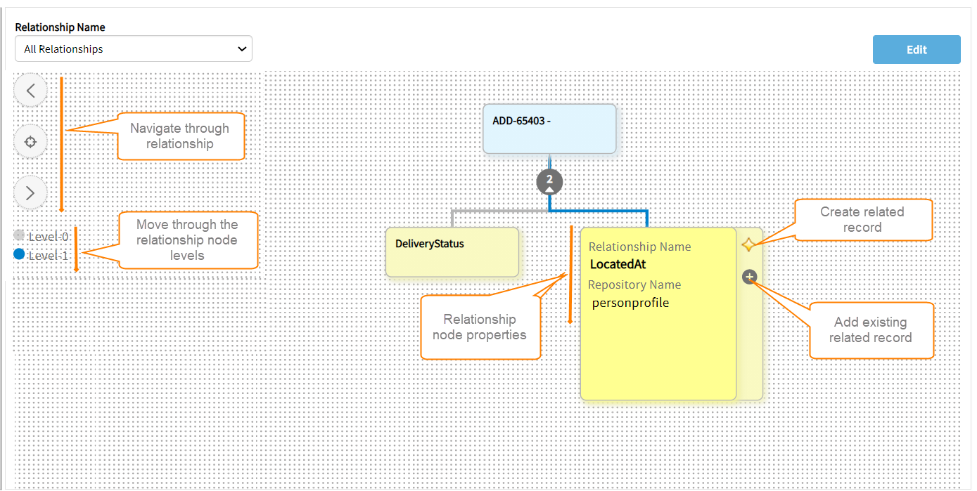 When you click Edit, the relationship mode on the canvas changes from view to edit. You can perform the following actions in the edit mode: