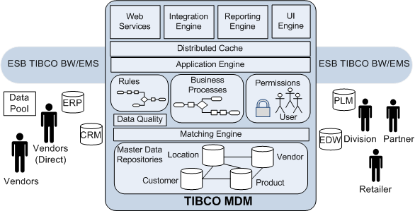 TIBCO MDM is based on a flexible business process automation framework that employs workflow and user-configurable business rules to streamline processes required by the enterprise, such as record modification, security, synchronization and publication, and new record introduction. It works in conjunction with multiple, heterogeneous systems that affect or use master data information. It also automates global data synchronization with external trading partners through industry standard data pools, such as 1SYNC.