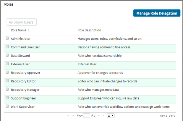 The Roles page is accessed by clicking . It displays all the available roles and their description. On this page, you can select a role and click Show Users to view the users assigned to that role. A user may be assigned to more than one role. You can view a list of users alphabetically when you click Show Users.