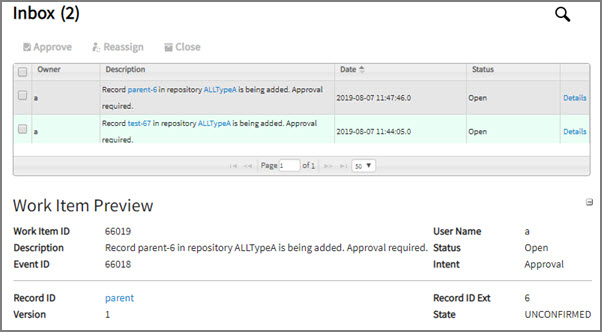 Important: If you click the Details link for Supported and Unsupported Work Items for Simplified and Extended Inbox Pages, the Classic Inbox page is displayed instead of the Work Item Details page. - Work Item Preview: Click the work item row (except the first check box and the