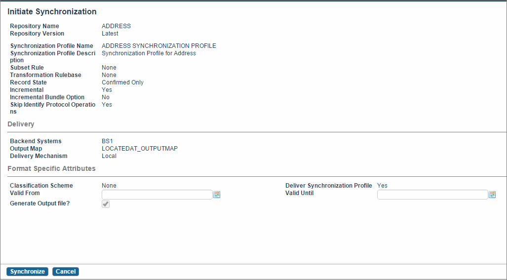 If you do not have an existing synchronization profile, create one by referring to the Creating a Synchronization Profile section. The page that is displayed has the information that you filled in when you created the synchronization profile. - Click Synchronize. The Synchronization Status page is displayed.
