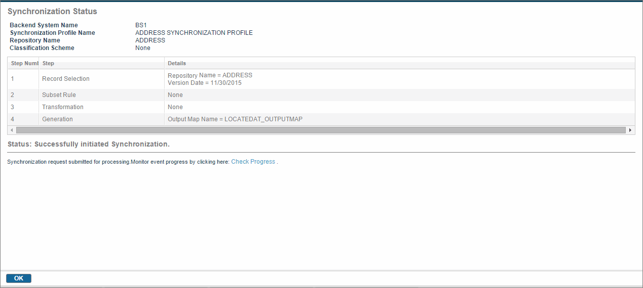 - Click Check Progress to monitor the progress of synchronization. Once the synchronization process is over, if you have chosen Local to be the delivery mechanism, a ZIP file is created.