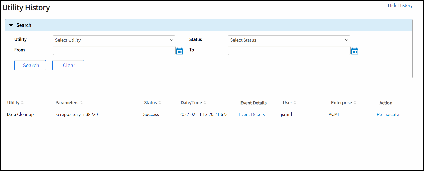 | Utility | To view the Data Cleanup history, select the utility as Data Cleanup. |