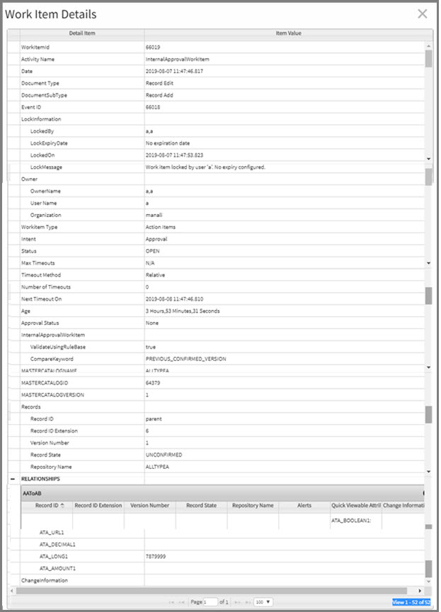 From the simplified inbox page, click the Details link in the last column of the work item list. The Work Item Details page is displayed. The columns on the Work Item Details page can be sorted. If any associated records are present in the work item, those records are also displayed in a tabular form within the Details column.