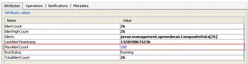 - Attributes: Select the MBean to view its attributes. If the attribute is writeable, the value is displayed in blue. You can change the value. For example, the value of the MaxAlertCount attribute is displayed in blue in the following image: