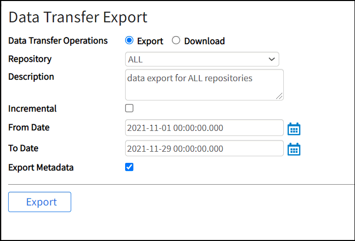 - If you do not select from and to dates, and also do not select the Incremental check box, all records are exported from the selected repository.