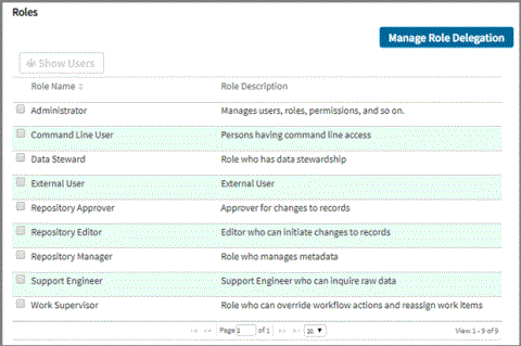 The Roles page is accessed by clicking . It displays all the available roles and their description. On this page, you can select a role and click Show Users to view the users assigned to that role. A user may be assigned to more than one role. You can view a list of users alphabetically when you click Show Users.