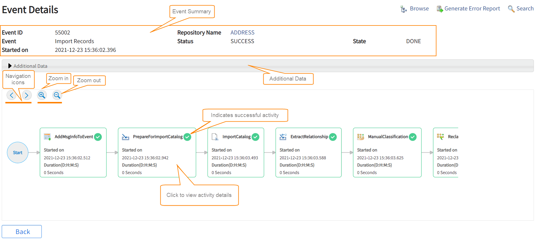 Diagram shows sequence of activities executed for the event. Each box indicates activity, with details such as Started On and Duration. Click each activity to view its details. For example, if you click the ImportCatalog activity, the selected activity details such as input and output parameters are displayed under the diagram.