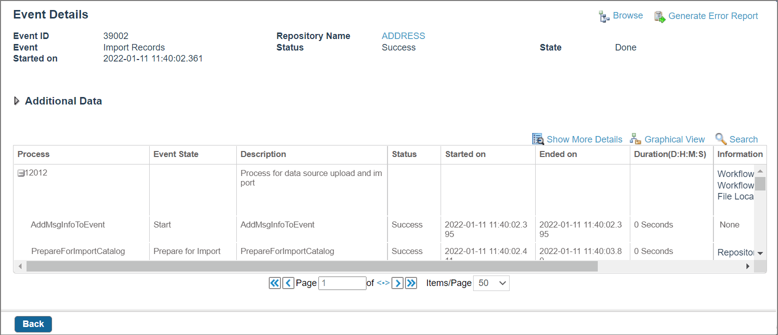 | Browse | The Browse link appears only for the Import Records event. Click the Browse link to go through a list of records that are being imported. For remaining events, the Browse link is not displayed. |