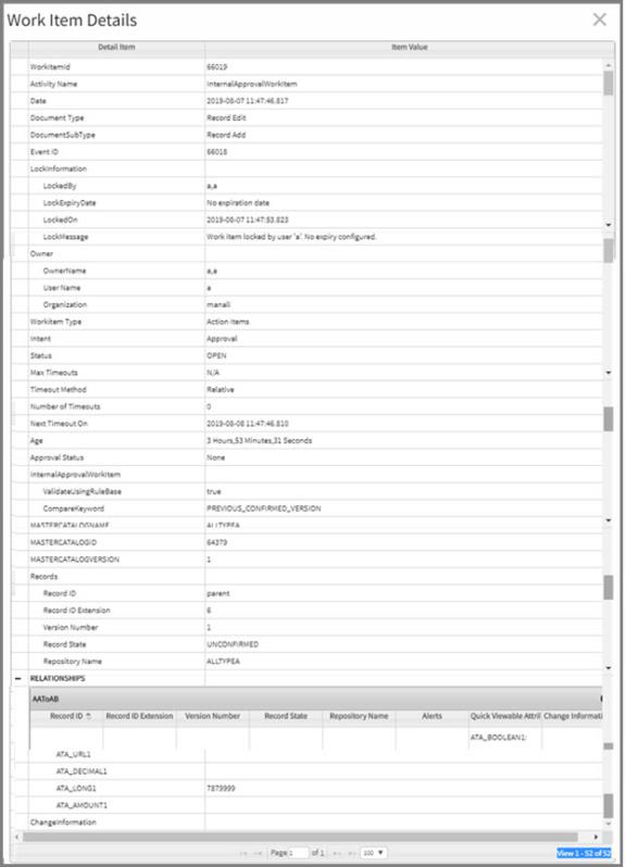 From the simplified inbox page, click the Details link in the last column of the work item list. The Work Item Details page is displayed. The columns on the Work Item Details page can be sorted. If any associated records are present in the work item, those records are also displayed in a tabular form within the Details column.