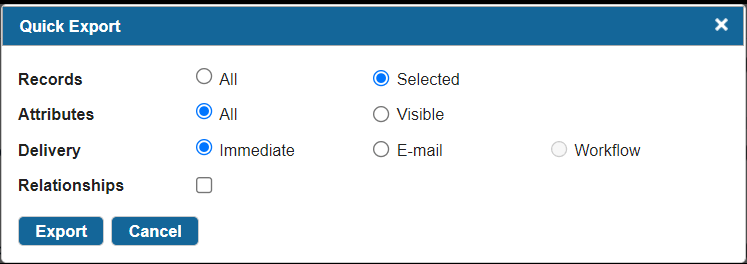 - In the Quick Export dialog box, you can define your export preferences for records and attributes. For details, see Quick Export Options.