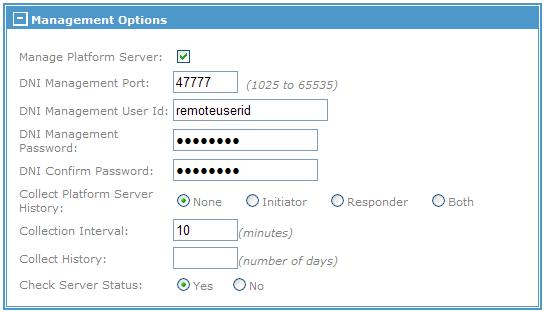 to open theBe sure to expand the Management Options section to set the DNI Management Port, DNI Management User Id, and DNI Management Password fields you configured in Setting up DNI Daemons on TIBCO Platform Server.