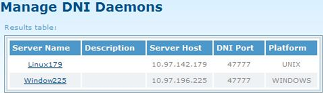 to open theThe following figure shows the Manage DNI Daemons page with two DNI daemons defined: