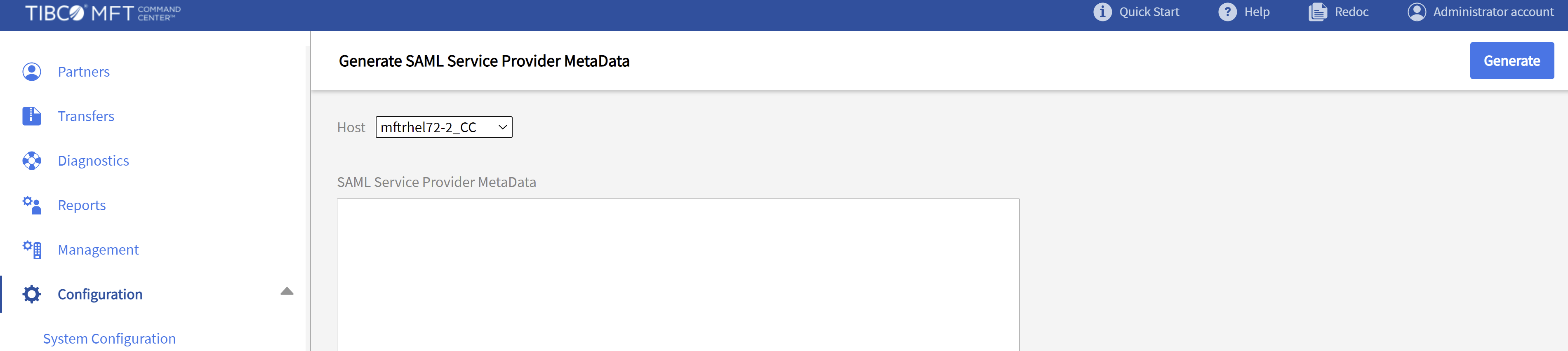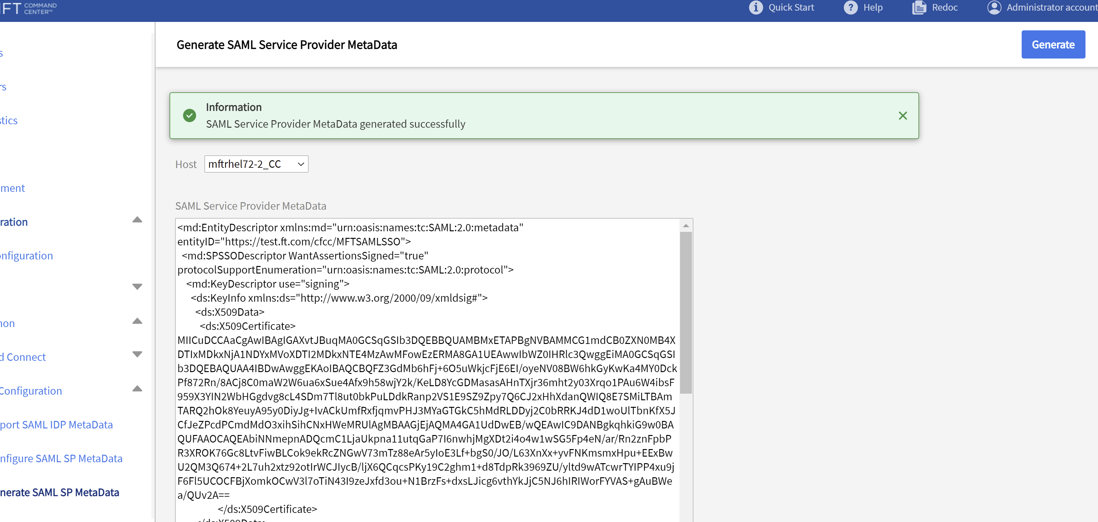 Click Generate to generate the service provider metadata. A text box that contains the service provider metadata is displayed. This information must then be sent to the SAML identity provider.