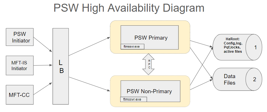 TIBCO MFT Platform Server for Windows (PSW) now supports High Availability (HA) when running behind a load balancer. This allows multiple systems to appear to the transfer partner as a single system. The following figure illustrates how high availability works: