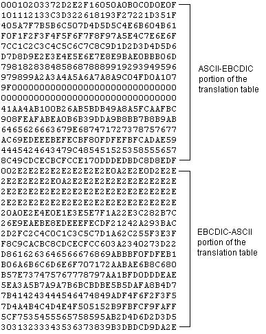 The first 16 lines in this file are used when sending data to a partner, that is, converting ASCII data to EBCDIC. The last 16 lines are used when receiving data from a partner, that is, converting EBCDIC to ASCII. ASCII to EBCDIC translation is typically performed on the ASCII systems (Windows and UNIX) and not on the EBCDIC systems (z/OS and IBM i). You can specify two conversion tables: one on the local side (LCT), and one on the remote side (RCT). If you want to perform translation on one side of the transfer and not on the other side, specify a translation table of None.