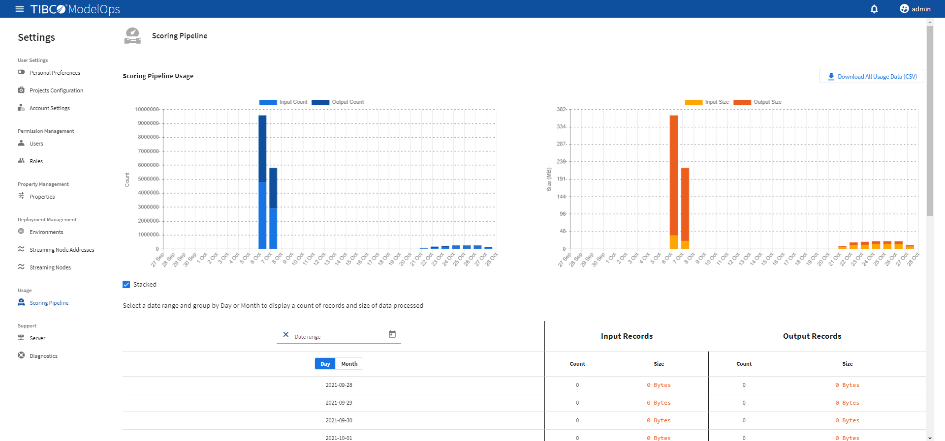 You can see the graphical representation of scoring pipeline usage. The ModelOps UI offers two charts based on count and size. You can download all the usage data by clicking the Download All Usage Data (CSV) present at the upper-right corner of the page. You also get the option to see the usage graphs in stacked format by checking the box for Stacked present below the graphs.