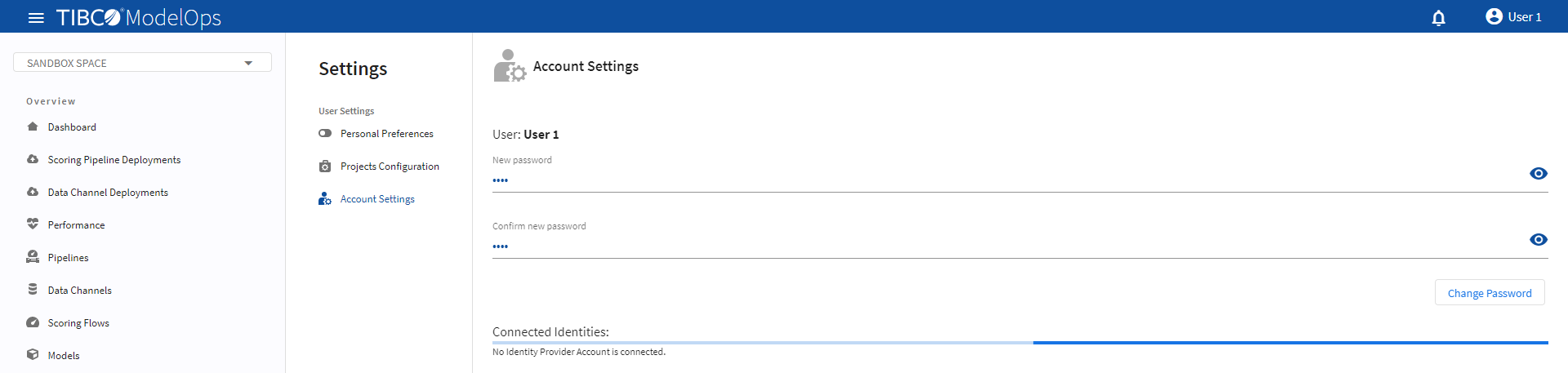 - Click Change Password. Changes take effect the next time you or another user signs into TIBCO ModelOps.