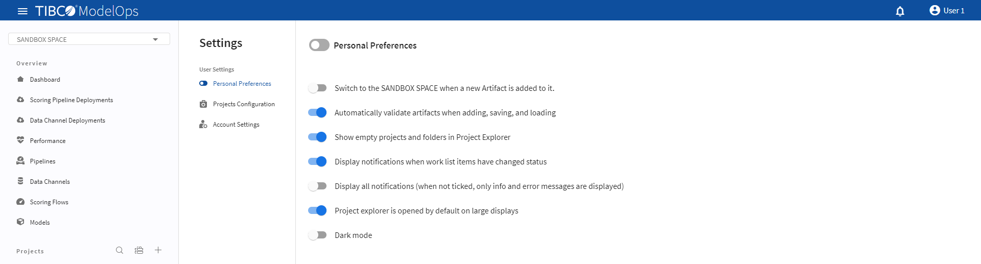 This section helps ModelOps administrator to set preferences for different users. Click Settings and Preferences at the end of Project Explorer to see User Settings and define the following options: